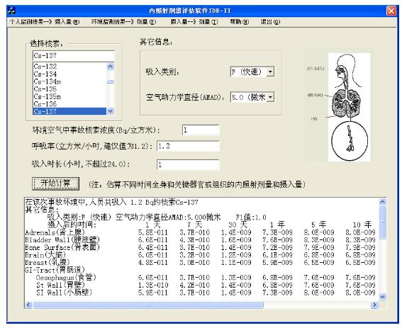 技術指標:最終計算結果的精度:3位有效數字。四舍五入到2位有效數字時,與ICRP78號報告給出的數據完全一致(ICRP78號報告僅給出兩位有效數字的精度)。可計算的元素及核素:GB18871-2002《電離輻射防護與輻射源安全標準》中列出的所有31-91種元素及相關的核素。攝入途徑:食入、吸入、傷口或皮膚攝入。攝入類型:急性、連續。