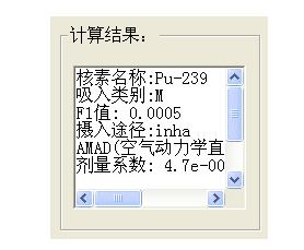 點擊“環境監測結果 --》劑量”菜單,進入由環境監測結果計算劑量”界面。其運行中的一例截圖如下圖所示: